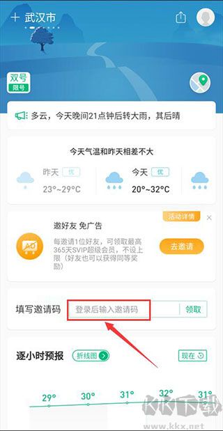 2、逐小时预报上方就是填写邀请码的地方了,但是需要登陆后才可进行操作。
