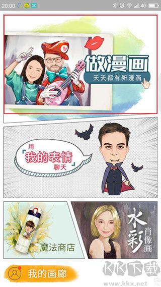 1、在主页面上,我们可以看到它有4大板块,分别是做漫画,用我的表情聊天,水彩肖像画和魔法商店,以及做好以后的作品我的画廊。今天我们要将的是漫画制作,因此其他的几项我们不用管,用手指触一下便可进去了。