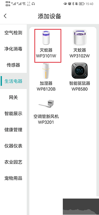 2、挑选要增添的设备与型号,如灭蚊器 WP3101W。