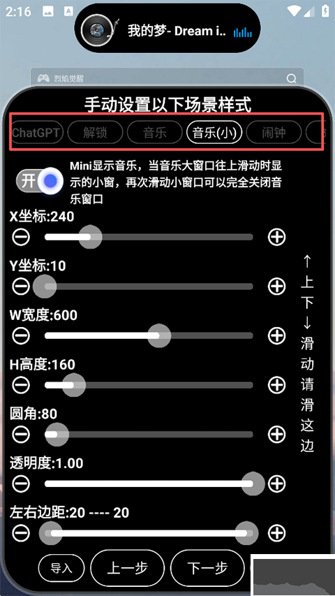 2、在上方预览各个插件的灵动岛效果,下方调整灵动岛的坐标位置、宽度高度、形状透明度边距等,继续下一步;