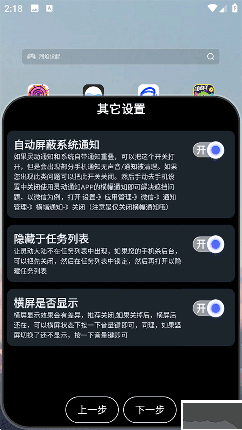 4、其他设置:如自动屏蔽系统通知、隐藏于任务列表、横屏是否显示,继续下一步;
