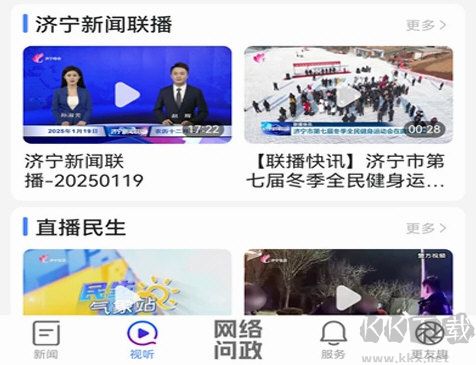 2、视听:视听模块可直接收看(收听)济宁广播电视台 4 套电视节目和 4 套广播节目的实时直播,实现最长 7 天之内的节目回看和两天之内的节目预约收看;可以点播收看济宁广播电视台所有独家原创视频节目。