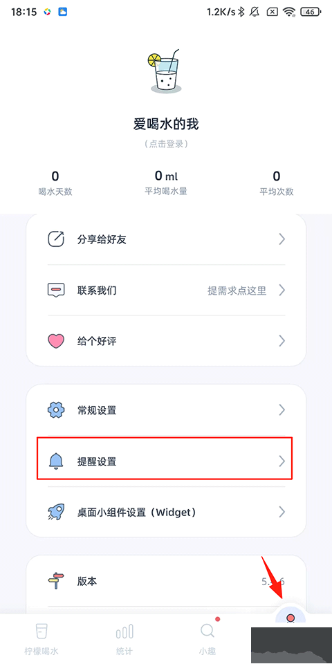 1、打开柠檬喝水APP,点击【我】-【提醒设置】;