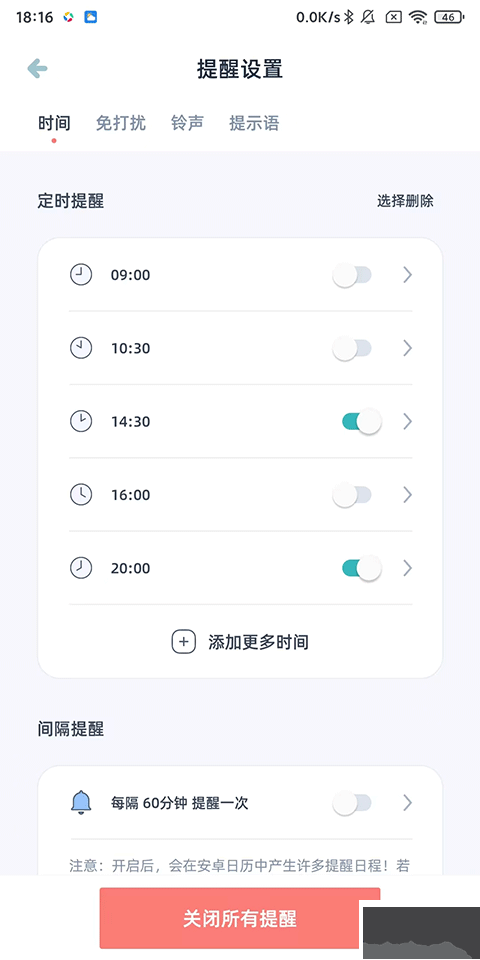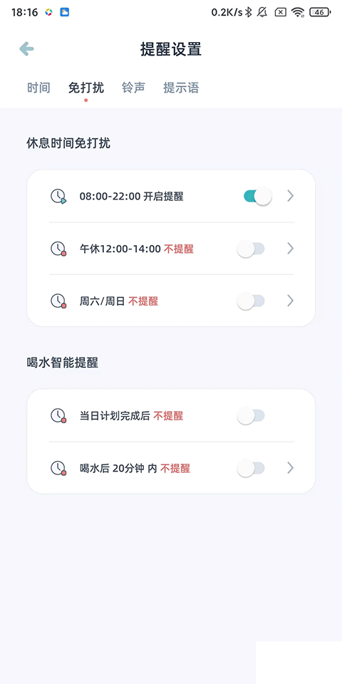 3、点击免打扰,还可以关闭自定义时段的喝水提醒。