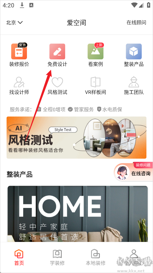 1、打开爱空间装修App,在首页找到并点击【免费设计】入口;