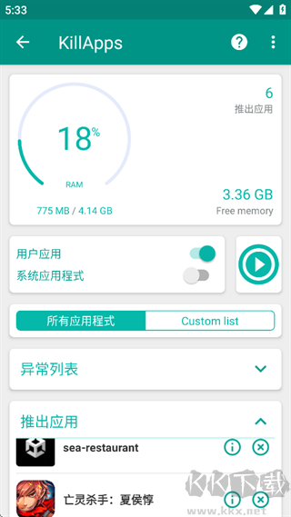 3、支持关闭用户安装的应用以及部分系统级应用程序,管理更全面。