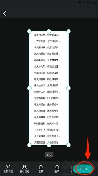 3、在图片编辑界面选择识别的范围,可以全部识别或自动识别,点击下一步识别即可。