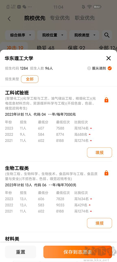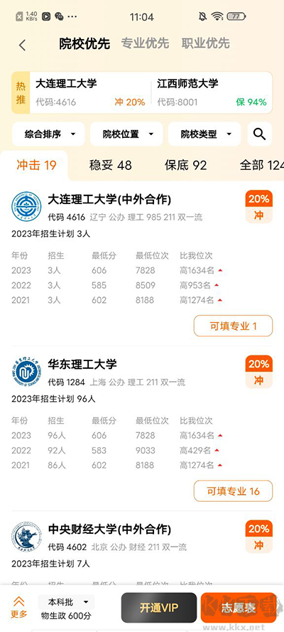 3、软件会帮你将可以报名的学校列举出来,并将其分为:可冲击、较稳妥、可保底三大类。