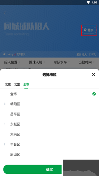 2、根据实际情况选择定位,找到自己周边的球队