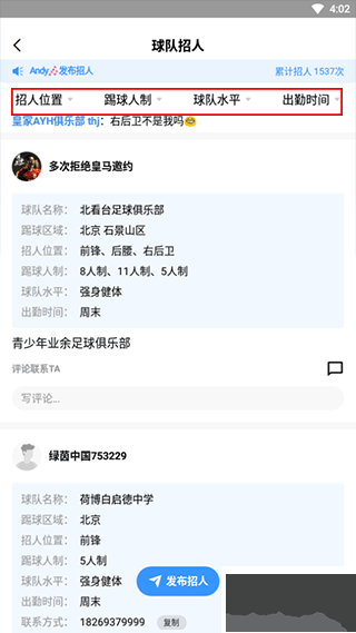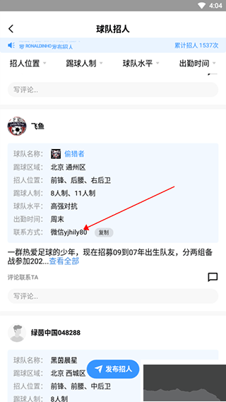 4、发布招人的球队会留下球队联系人的信息,找联系人私聊即可
