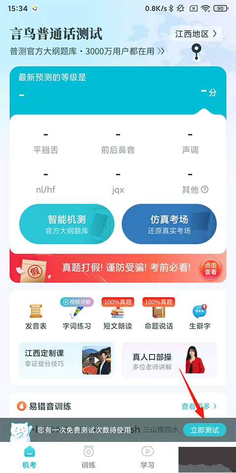 1、打开普通话测试APP,注册登录后可以免费获得一次测试次数,点击下方的立即测试;