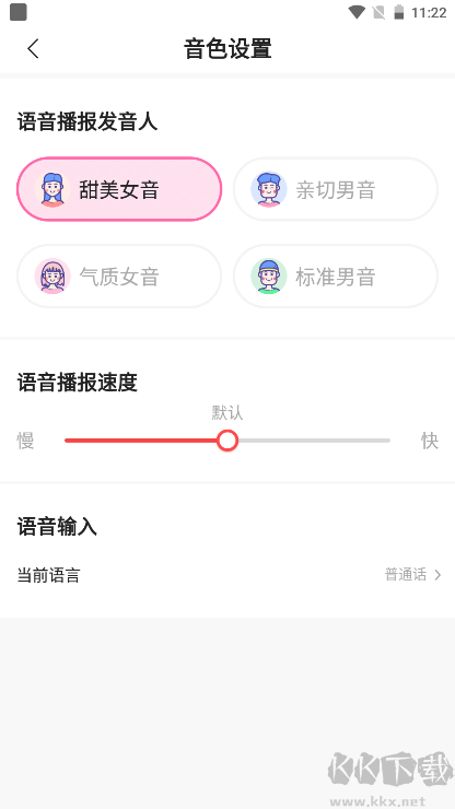 3、我们可以可按照自身喜好进行音色的设置,比如说设置成甜美女音、亲切男音等;还可以设置语音播报的速度;