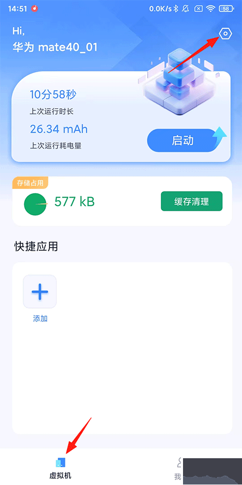 1、打开密盒虚拟机APP,点击右上角的设置按钮;