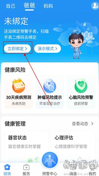 首先用户需要在健康页面,点击上方的立即绑定就可以开始绑定手表了。