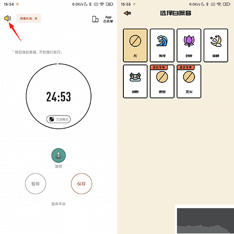 5、使用番茄闹钟功能还可以选择海洋、时钟、夜晚等诸多白噪音,帮助您在舒适的环境下更加地专注工作学习。