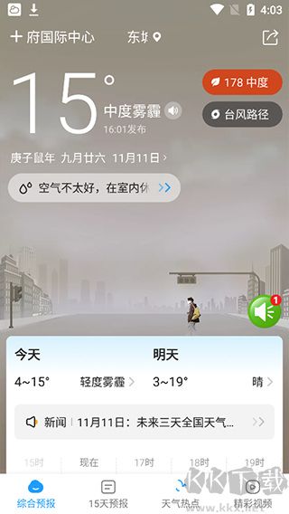 1、下载安装软件后打开,进入软件首页就会显示现在的温度及天气状况;