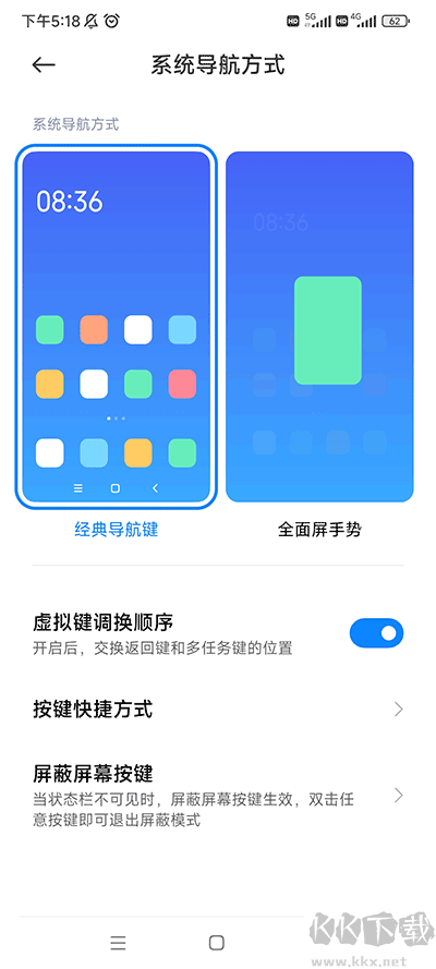 3、选取传统按键模式,界面下方即显现返回按钮,全屏操作模式不配备此按键。