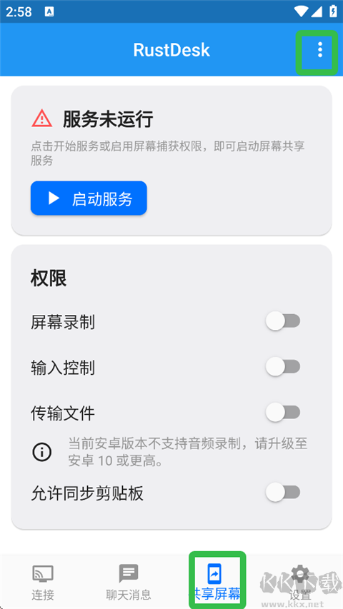 1、打开RustDesk,进入【共享屏幕】页面,点击三点标识。