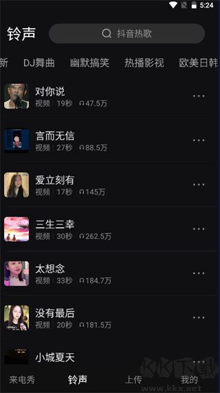 4、点击铃声可选择各种类型的铃声,如DJ舞曲,幽默搞笑,热播影视,欧美日韩,游戏动漫,情侣,粤语,古风等。