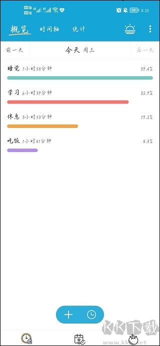 内置精准计时器,并以时间轴形式直观呈现全天活动轨迹,便于回溯与复盘;