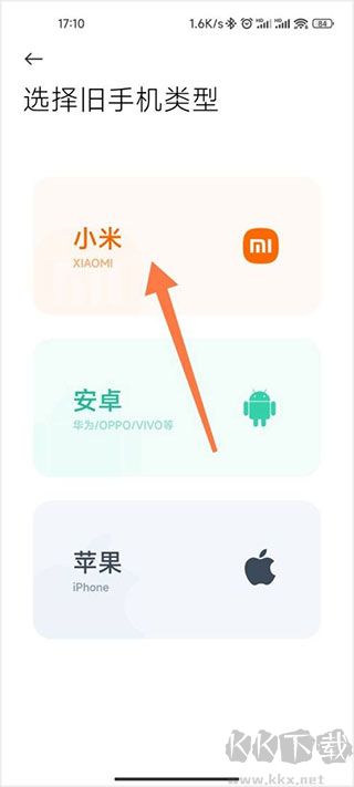 3、旧手机类型中选择【小米】,根据旧手机的手机类型选择;