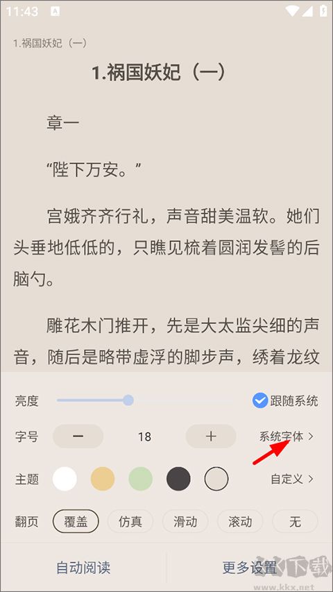 3、设置中打开阅读亮度、字号、主题以及翻页模式等,点击系统字体;