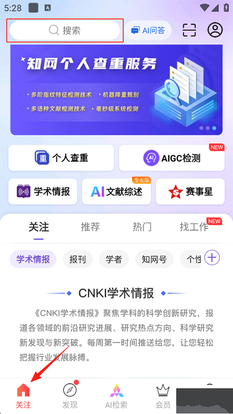1、打开手机知网APP,点击屏幕上方的搜索栏;