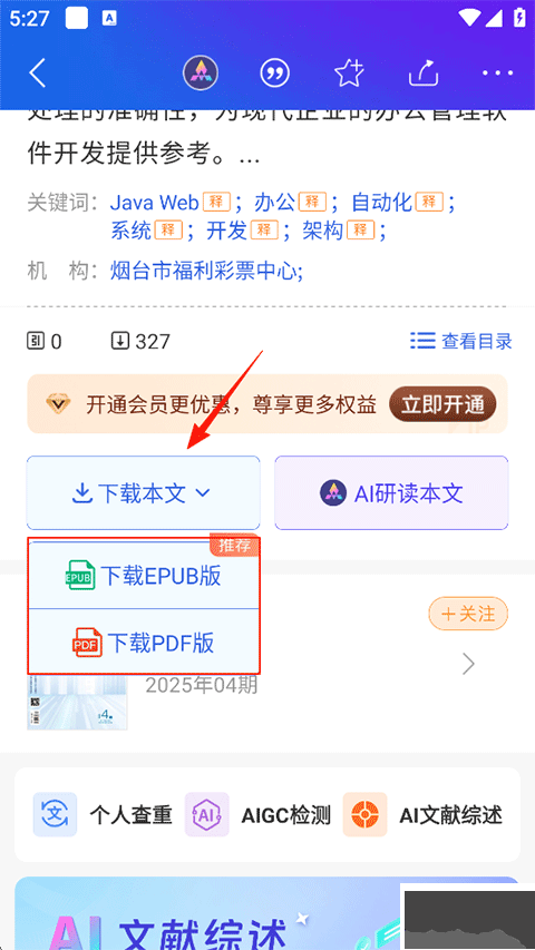 3、打开需要下载的论文,往下滑动,点击下载本文,选择下载格式即可;注意:下载论文到本地需要付费。