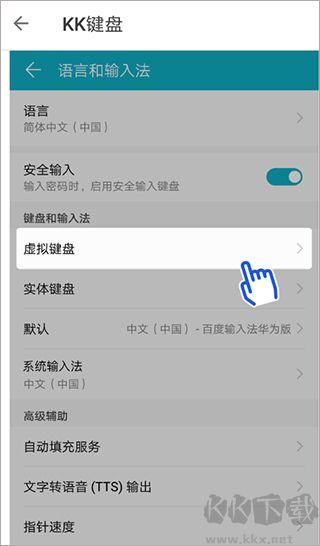 3、还可以选择去手机的设置页面里找到“语言和输入法”功能,从“虚拟键盘”的功能里设置KK键盘为默认输入。