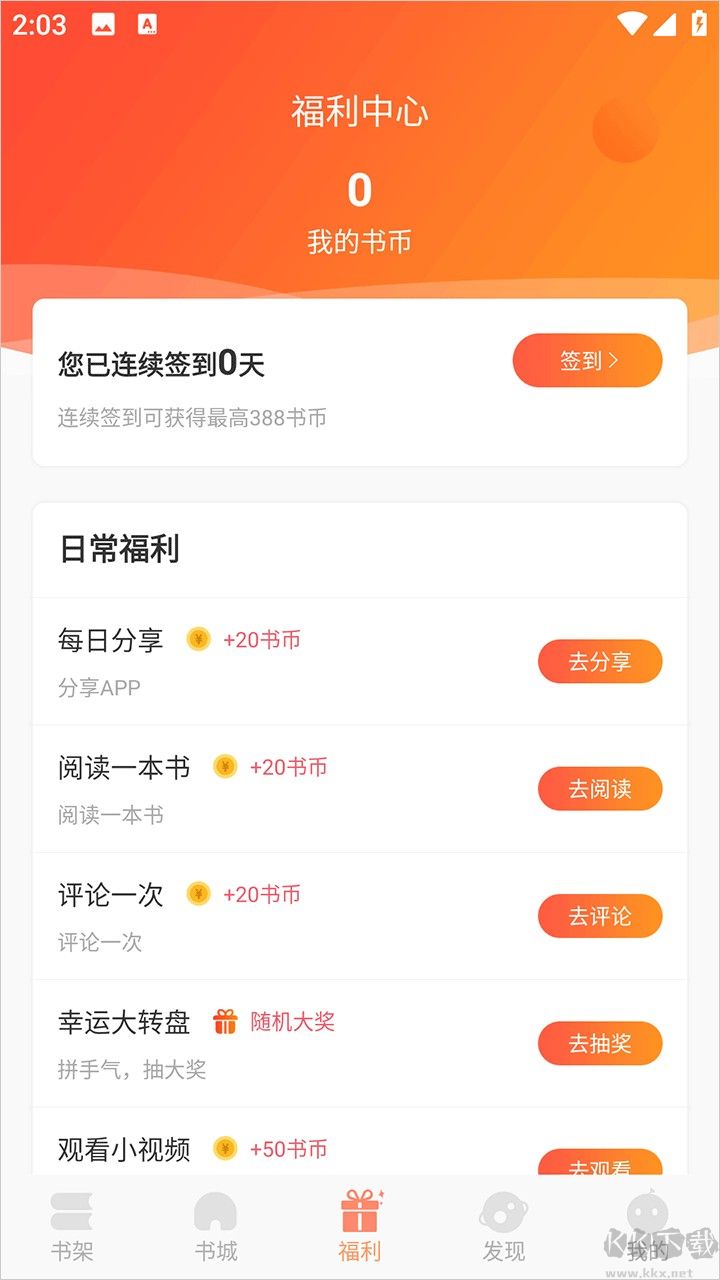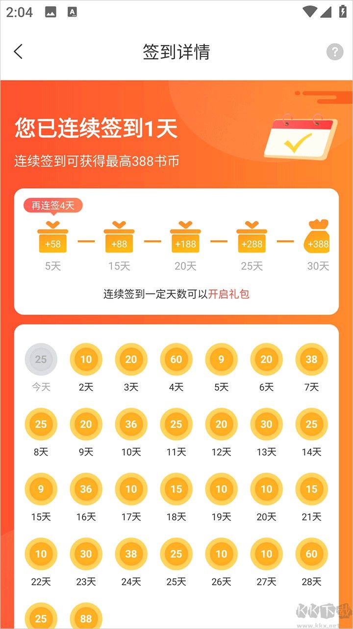 2、每日签到可以获得每日的书币,连续签到还可以开启礼包