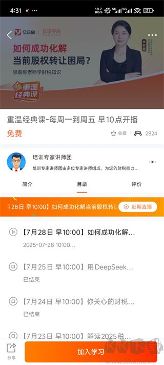 亿企学会app是一款财税知识研习应用,内容围绕法规解析与实务处理展开,汇集行业专家智慧,设计阶梯式研习模块,剖析常见企业税务难点,给予明确应对策略,里面包含政策速递、专题讲解、互动问答等多种形式,紧贴新政动态与实操要领,帮助从业者扎实掌握核心技能,拓展专业视野,伴随每一步进阶。