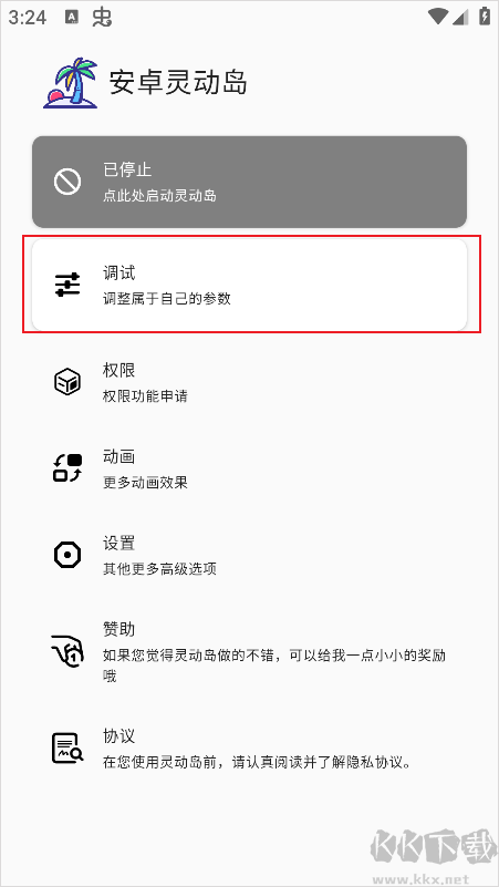 1、安装后打开灵动岛app设置工具,进入软件后点击上方的调试功能。