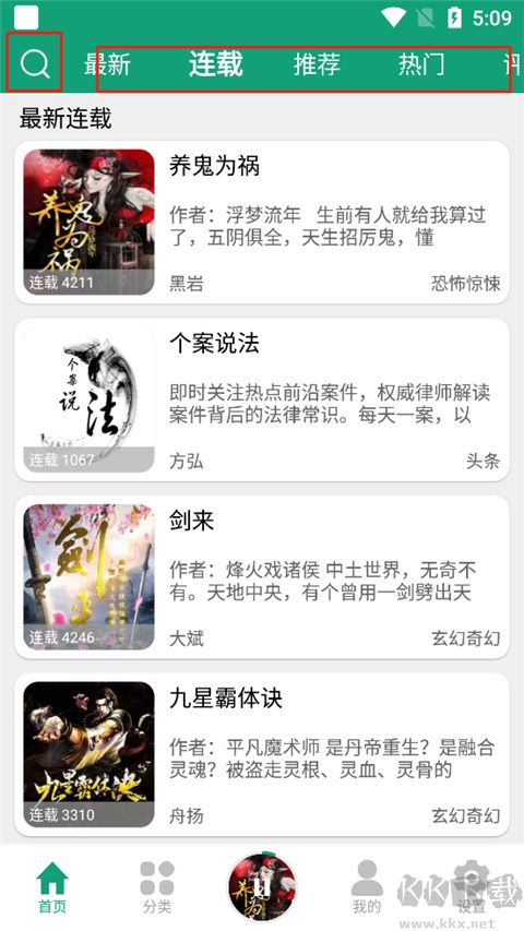 1、点击进入软件,里面为用户提供了最新、连载、推荐、热门等排行榜供你选择,你也可以点击搜索框,输入自己喜欢的小说;