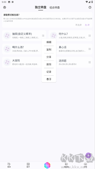 4、全面自定义转盘样式,轻松创建专属用途转盘,如真心话大冒险、抽奖活动、酒吧游戏、今日任务等,玩法随心切换。