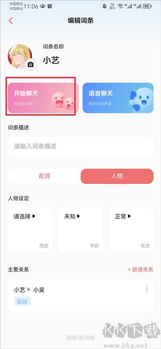 4、最后在人物词条界面中点击开始聊天就可以和自己创建的角色对话啦
