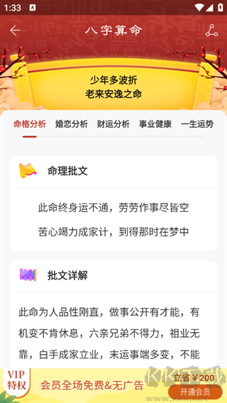 1、八字算命:根据用户输入的出生年月日时,软件将进行详尽的八字排盘与解析,涵盖家庭婚姻、学业事业等多个方面,为用户提供贯穿一生的命运指引。