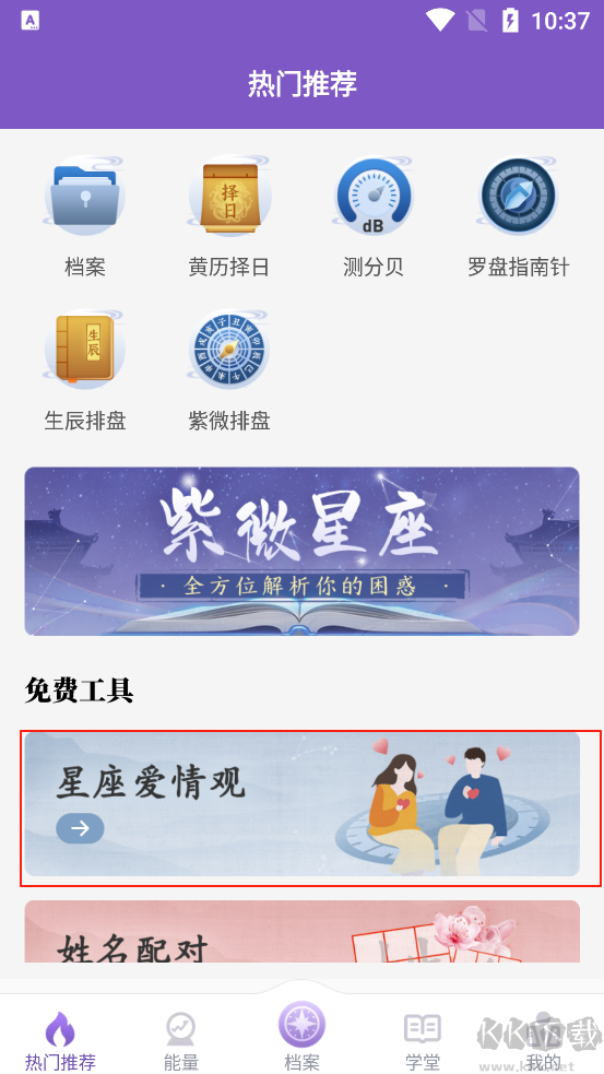 1、灵动紫微手机版内可以看到有很多测试工具点击星座爱情观