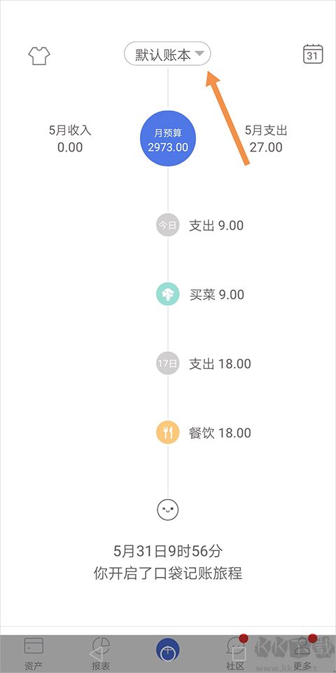 1、进入账单页面,点击顶部中间位置的账本下拉菜单(参考下图中橙色箭头指示)。
