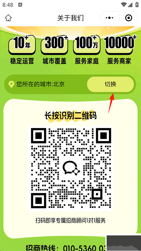 3、在跳转的微信小程序中切换到您所在的城市,并扫描以下二维码进行申请入驻平台。