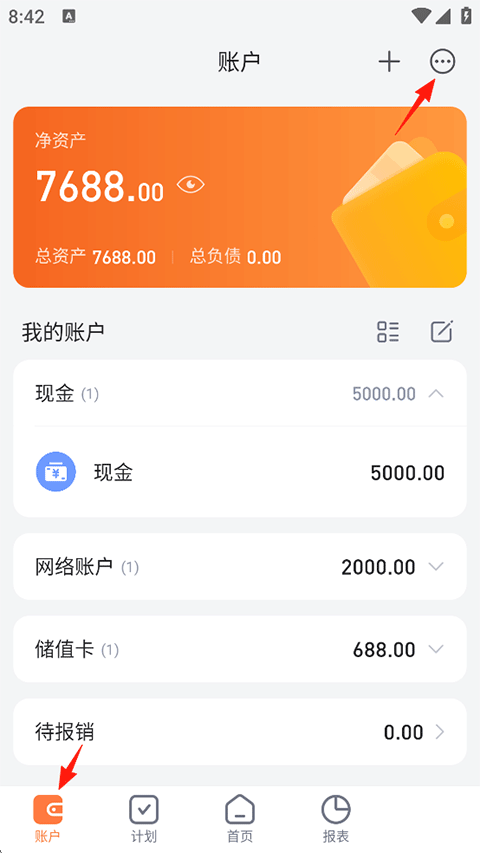 1、打开挖财记账APP,点击账户页-右上角扩展按钮;