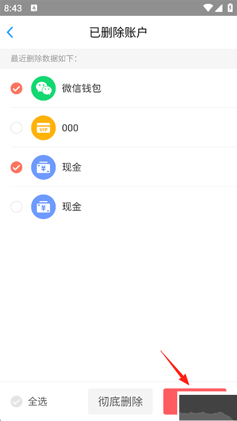 3、进入后选择需要恢复的数据账户,点击恢复即可。