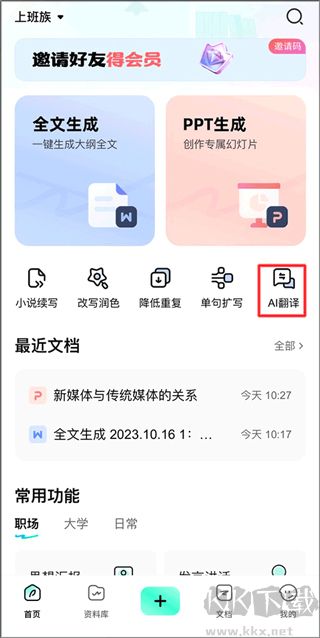 1、点击光速写作app首页的“AI翻译”。