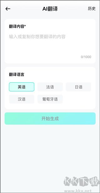 2、输入想要翻译的内容,选择语言,点击“开始生成”。