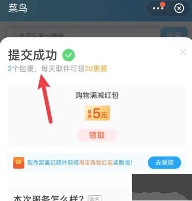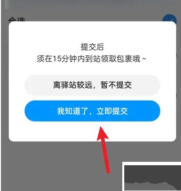 2、提交的时候,系统会提示必须15分钟内到驿站领取包裹,点击立即提交;