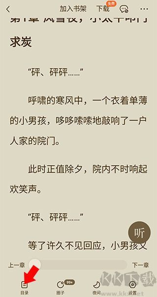 1、选择想要下载的小说后,来到小说阅读界面,点击小说正中间区域即可弹出菜单;