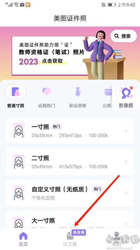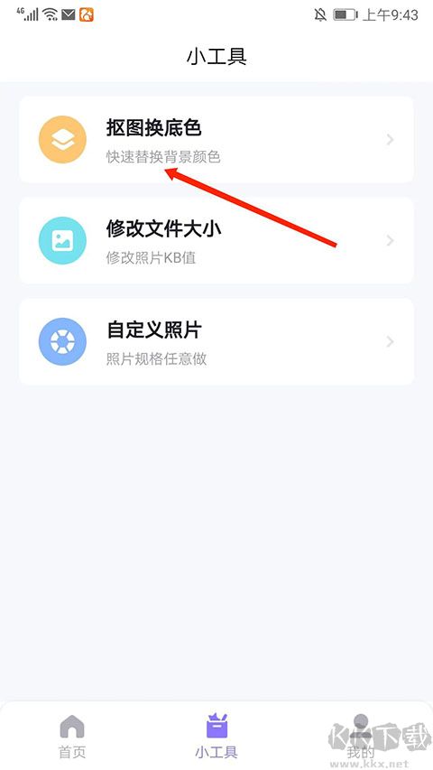 2、进入到小工具界面,包括“抠图换底色”、“修改文件大小”和“自定义照片”等功能,选择“抠图换底色”选项,