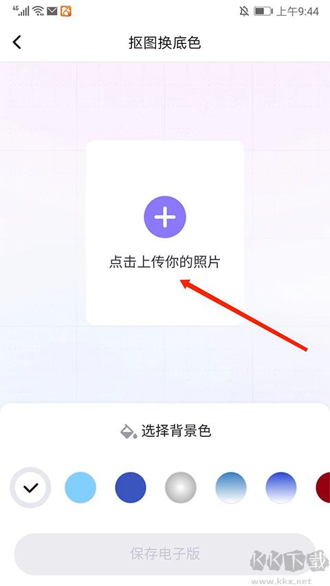 4、导入照片后,在下方选择需要的背景色进行预览,最后选择右下角“保存电子版”即可更换底色了。