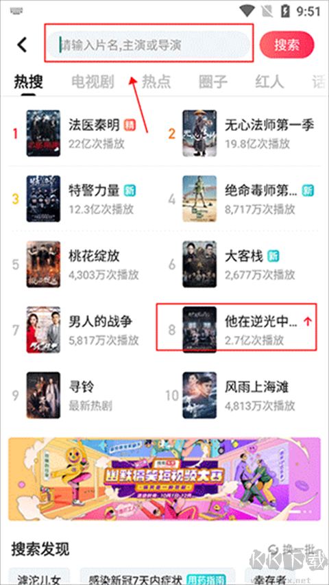 2、会看见很多的近期热搜推荐,如“法医秦明、无心法师第一季、特警力量、绝命毒师、桃花绽放、大客栈、男人的战争、以及他在逆光中”,这里小编选择他在逆光中,作为示例,如果推荐中没有你想要的,在搜索框搜索即可;