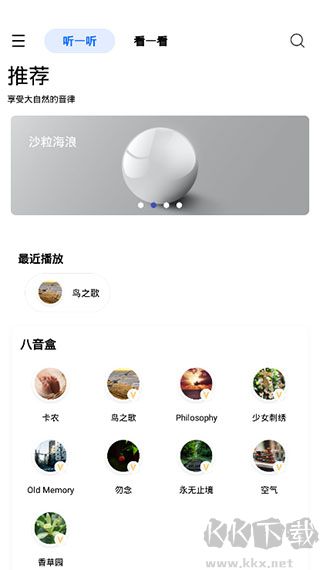 1、打开白噪音app,进入听一听模块,倾听自然声音与古典乐器声
