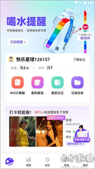 集成多种健康管理小助手,包括饮食打卡、热量查询、饮水提醒、运动追踪等功能,细致记录你的点滴进步,助力养成规律、自律的健康习惯。
